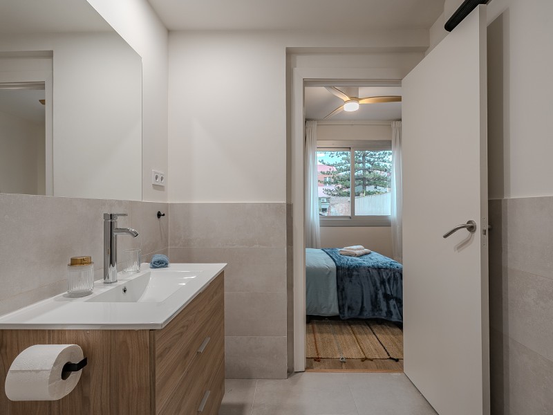 A fully equipped kitchen. A spacious and bright living room that connects to an interior patio. And room 6, also with a private bathroom.